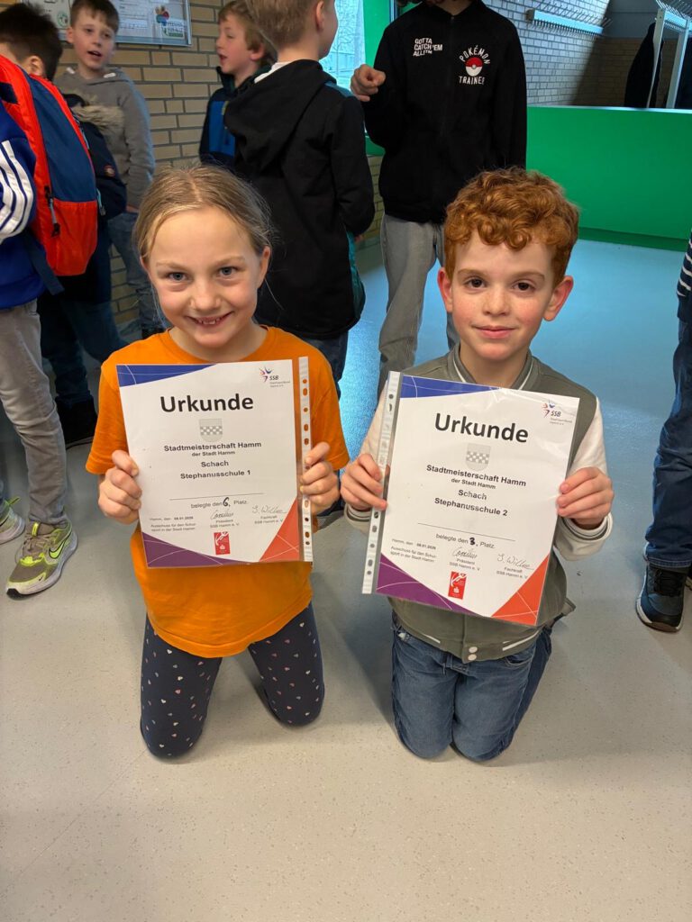 Am vergangenen Donnerstag, 08.01.2026, wurde in Heessen wieder die Stadtmeisterschaft im Schach der Hammer Schulen ausgetragen. Die Stephanusschule war diesmal mit zwei Mannschaften vertreten. Dies waren die ersten Vergleiche mit anderen Schulmannschaften und so war die Anspannung sehr groß. Aber die Mannschaften haben sich hervorragend geschlagen und erreichten am Ende die Plätze 3 und 4. Somit war sogar eine Mannschaft auf dem Siegertreppchen vertreten – ein Erfolg, mit dem vor dem Turnier keiner gerechnet hatte. Folgende Schülerinnen und Schüler waren dabei: